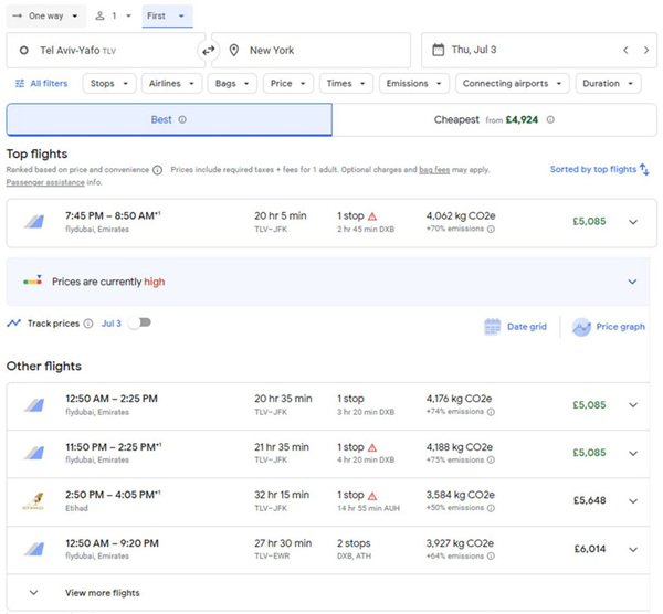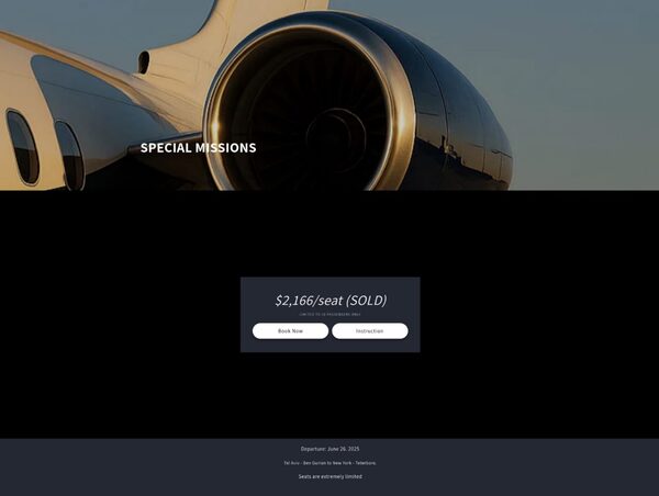 最後に、広告にある1座席あたり2166USドルという価格は、ハイエンドチャーター機との記載がある割に価格が非常に安く、現実的ではありません。比較として、2025年7月3日(木)のテルアビブ発ニューヨーク行きの民間航空のファーストクラスチケットの価格は、£5085(約6976.70USドル)から£6014(約8251.30USドル)の間です。価格が大きく異なることは、このオファーの正当性に関する大きな疑念を引き起こし、詐欺的な意図が強く示唆されます。