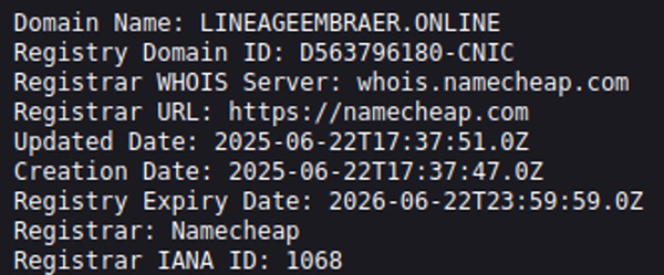2025年6月22日に、ドメイン「lineageembraer[.]online」が登録されたことが、FortiGuard Labsのツールにより検知されました。その後すぐに、当該ドメインのオンライン稼働が開始されました。