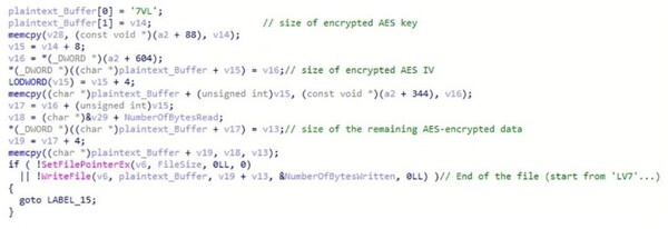 各スレッドはまず、暗号化されたファイルのフッターを解析します。ランサムウェアは「LV7」マーカーを検索し、後に続く以下のデータを読み取ります。