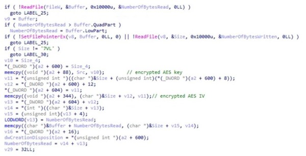 IOCPに送られた各ファイルはワーカースレッドで処理され、ユニークなAESキーとIV(初期化ベクトル)を使用して暗号化ルーチンが実行されます。