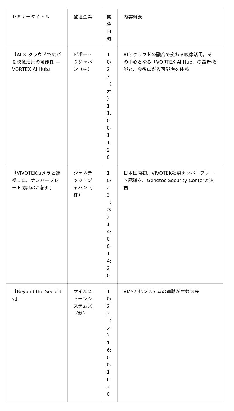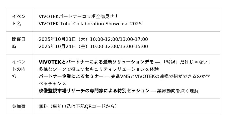 インテリジェントなセキュリティソリューションで社会の信頼に応える、グローバルリーダー VIVOTEK Inc.(本社:台湾・新北市 TWSE: 3454 以下ビボテック)は、2025年10月23日(木)~10月24日(金)の2日間、東京ポートシティ竹芝 PORT STUDIOにて、『VIVOTEKパートナーコラボ全部見せ!Total Collaboration Showcase 2025』を開催いたします。本イベントでは、VIVOTEKとパートナー企業が協力し、展示・セミナー・特別セッションを通じて最新のソリューションと未来の可能性を紹介します。昨年の「全製品展示」から一歩進化し、今年は“パートナーコラボ”に重点を置いた、多彩でわくわくするプログラムをご用意しました。