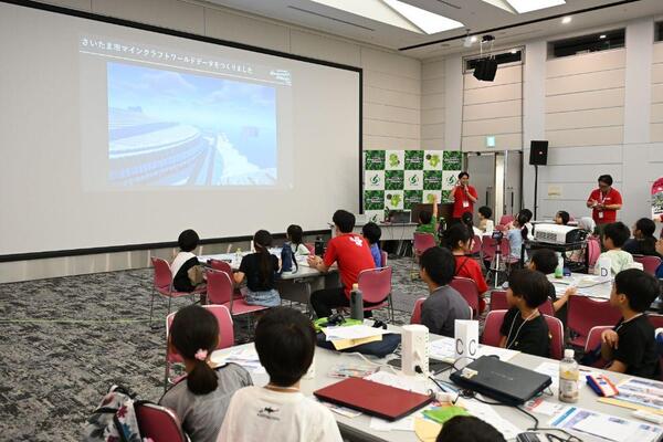 8月10日のワークショップには、さいたま市在住の約50人の小中学生が大宮ソニックシティの国際会議室に集まり、サポーターとともにマインクラフトを使って“未来のさいたま市”のまちづくりを楽しみました。