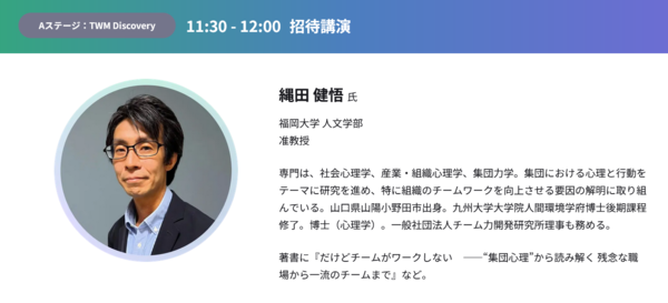 11時30分からの招待講演では「だけどチームがワークしない――“集団心理”から読み解く 残念な職場から一流のチームまで」の著者である福岡大学の縄田健悟氏が多様性時代のチームワークを読み解く。社会心理学の研究をもとに、心理的安全性・信頼・協働の構造を明らかにし、成果を生むチームの本質に迫るという。「チーム」の本質に関心がある方、理論と実践の接点を学びたい方、多様性のあるチーム運営に課題を感じている方などにオススメだ。