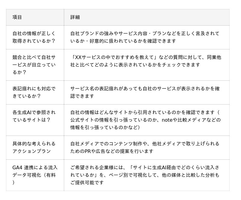 こうした中で、2025年4月頃からGoogleやMicrosoftも公式にAI検索対応の重要性を発表しており、対策が急務となっています。そこでまず必要になるのが、「生成AIから自社がどう見られているのか」を把握することです。