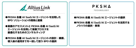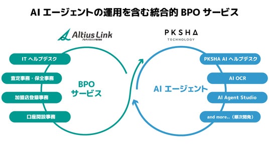 株式会社PKSHA Technology(本社:東京都文京区、代表取締役:上野山 勝也、以下PKSHA)とアルティウスリンク株式会社(本社:東京都渋谷区、代表取締役社長:若槻 肇、以下アルティウスリンク)は、経理・人事・購買等のコーポレート業務支援、ITヘルプデスクや業界特有のバックオフィスBPO(※)領域において、高機能AIエージェントとBPO運用を一体化した新たなBPOサービスの提供準備を開始したことをお知らせします。