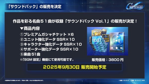 BGM切り替え機能で選べる楽曲を追加できる「サウンドパック」の発売が決定した。9月30日に販売開始を予定している「Vol.1」では51曲を収録。ぜひ入手してお気に入りの楽曲でジージェネエターナルを楽しもう。