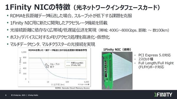 従来のコンピューティングのデータプロトコルは、短距離でのデータ処理を前提としている。そのため、RDMA(メモリに直接データを送受信する技術)のデータ転送で性能が低下するなど、距離を伸ばそうとするほど様々な課題にぶつかる。そこで、1Finity NICは新たなプロトコル処理を採用しており、100kmの長距離データ転送において従来比で20倍のデータ処理性能を発揮し、遅延も100分の1まで抑えるという。