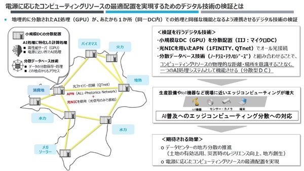 検証期間は、2025年10月から2026年3月までを予定しており、まずは、QTnet(九州電力グループ)の中核DCと小規模DCの2拠点でDC機能を分散配置して、AI処理と分散データベースの有効性を評価する。