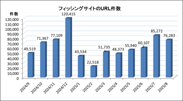 次に、フィッシングメール/SMSの誘導先(偽Webサイト)にあたる「URL件数(重複なし)」は前月より8989件減少して、7万6283件でした。ここ数ヵ月は増加傾向でしたが、ひと息ついたかたちです。