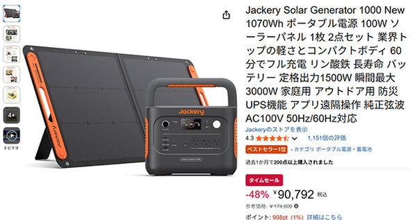 AmazonタイムセールでJackery Solar Generator 1000 New 1070Wh ポータブル電源(100W)+ソーラーパネル(1枚)2点セットが特価で登場
