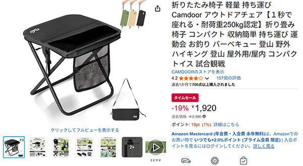 「Camdoor アウトドアチェア」が現在、Amazonタイムセールで19%オフの1,920円という特別価格で販売中。