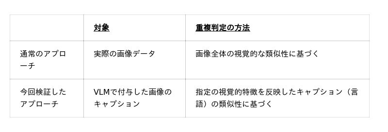 今回の検証においては、通常想定されるアプローチとは異なる方法で重複排除を実施しました。そもそもNeMo Curatorを活用して画像の重複排除を行う際、意味的に似ている画像を重複と判定して除外可能なSemantic Deduplication(SemDeDup)を利用できます。 SemDeDupでは、データのEmbedding(埋め込みベクトル)を使用して、データ間の類似度を計算し、類似度が高いものを重複とみなして除去することができます。今回、生成されるEmbeddingをある程度コントロールするために、通常想定されるアプローチである画像のEmbedding ではなく、VLMを用いて抽出した画像キャプションのEmbeddingを利用して、画像内において指定した特徴に注目して重複を排除するアプローチを行いました(以下、イメージ)。