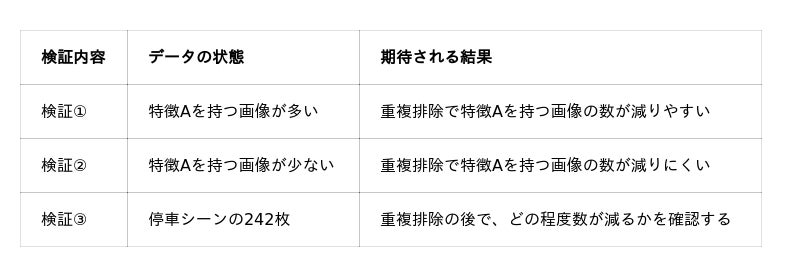今回、運転者視点で撮影された合計1,076枚のドライブレコーダー画像(停車状態5パターン、交差点、山間部など多様なシーンを含む)のうち、見た目があまり変わらない242枚の画像を対象に検証を行いました。また、重複判定において注目すべき特徴として複数の項目を設定し、これらを抽出できるプロンプトでVLMにキャプションを生成させています。同時に別途プロンプトを作成し、各条件をmetadataとしてjson形式で出力させつつ、複排除前後で各特徴の割合を確認できるようにしました。 これらを前提に以下を行いました。