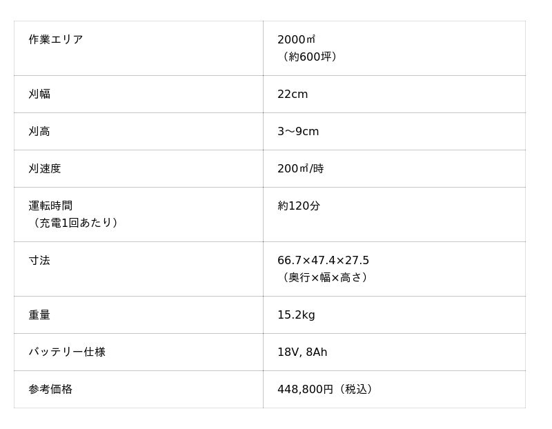 カット幅22cm、カット高さ3~9cm(アプリでの調整が可能)、最大傾斜45%(約24°)まで対応ができ、効率的かつ安定した刈り込みを実現します。斜面の芝生管理も安心です。