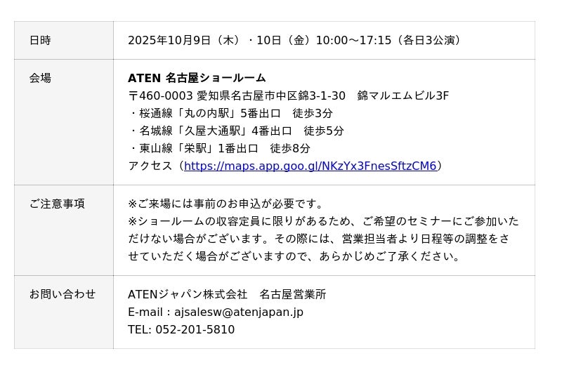 KVMおよびAV/IT接続・管理ソリューションのリーディングプロバイダーであるATENジャパン株式会社(取締役社長:鄧 鴻群 / Hans Teng)は、名古屋ショールームの拡張を記念し、2025年10月9日(木)・10日(金)の2日間、同ショールームにて「ソリューションセミナー」を開催いたします。