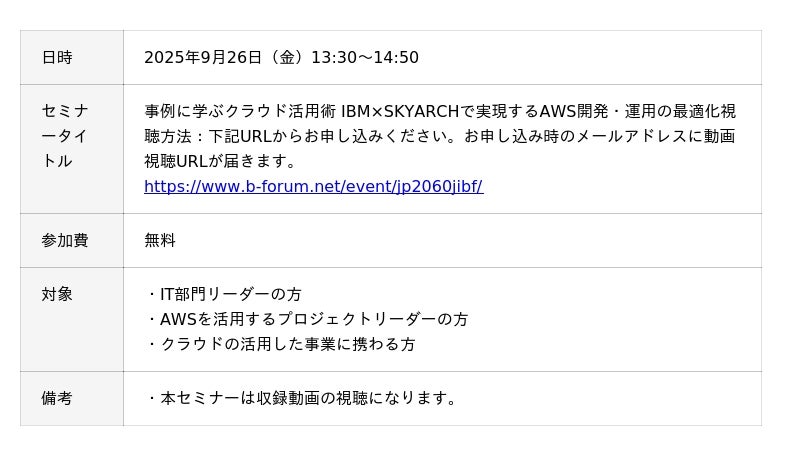SKY-OPT Enterpriseのリリースにあわせて、9/26(金)13:30より、IT部門リーダー向けオンラインセミナー「事例に学ぶクラウド活用術 IBM×SKYARCHで実現するAWS開発・運用の最適化」を開催いたします。当日は SKY-OPT Enterpriseの基本機能のほか、AI・自動化を活用したハイブリッドクラウドアプローチをテーマに、事例を交えて活用方法を解説します。ふるってご参加ください。