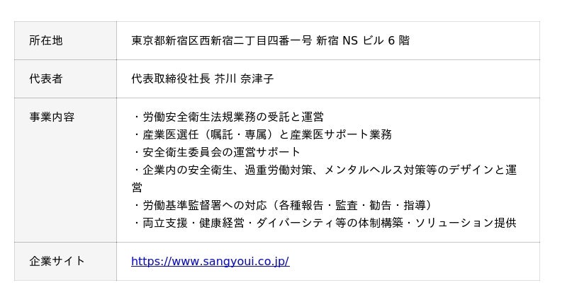ウェルネス・コミュニケーションズ株式会社(本社:東京都港区、代表取締役社⾧:松田 泰秀、以下:当社)は、産業 医紹介サービスにおいて、産業医選任と産業医サポート業務を展開するさんぎょうい株式会社(本社:東京都新宿区、代 表取締役社⾧:芥川 奈津子、以下:さんぎょうい社)と求人情報の連携に係る業務提携契約を締結いたしました。