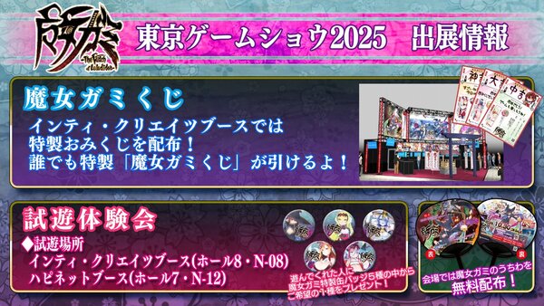 また、インティ・クリエイツブースでは、うちわの無料配布や試遊しなくてもチャレンジできるおみくじ「魔女ガミくじ」も用意。おみくじは主人公「シロハ」の楽しいコメント付きで、何が出るかは運次第。ぜひ、ゲームショウの思い出作りに「魔女ガミくじ」も楽しんでみよう。
