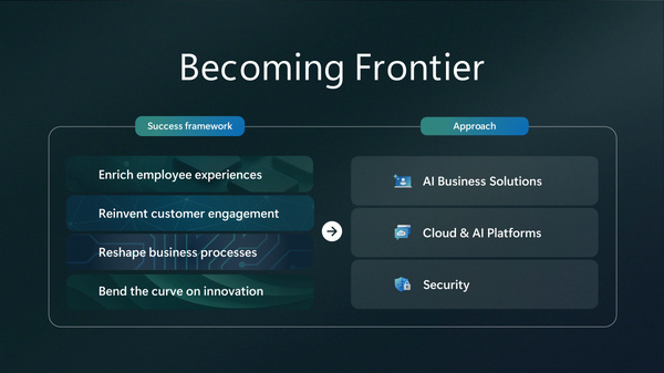 マイクロソフトが提唱するフロンティア企業(Frontier Firm、フロンティア組織)は、「企業や社会の課題を解決するために、生成AIやモデルを活用して、AIトランスフォーメーションを行う組織」と定義されている。フロンティア企業では、AIの活用によって「従業員エクスペリエンスの強化」「顧客エンゲージメントの改革」「ビジネスプロセスの再構築」「イノベーションの加速」といった恩恵が受けられるという。
