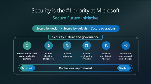こうしたセキュリティの重要性、AI規制に対応するガバナンスの実現などのために、マイクロソフトでは、2023年11月から「Secure Future Initiative(SFI)」の取り組みをスタートしている。これは、マイクロソフトがテクノロジーを設計/構築/テスト/運用する際のセキュリティ水準を高めるための取り組みであり、「Secure by design」「Secure by default」「Secure operations」という3つの原則に則り、「ID とシークレットの保護」「テナントの保護とシステムの分離」「ネットワークの保護」「エンジニアリングシステムの保護」「サイバー脅威の監視と検出」「対応と修復の加速」という6つの柱で構成されている。