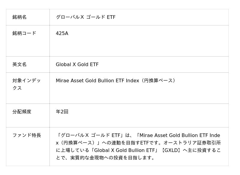 「グローバルX ゴールド ETF」【425A】