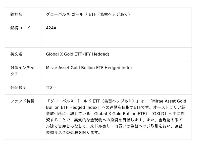 「グローバルX ゴールド ETF(為替ヘッジあり)」【424A】