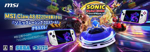 エムエスアイコンピュータージャパンは9月26日、SEGAとの公式パートナーシップを記念し、特定のMSI製ポータブルゲーミングPC「Claw A8 BZ2EM」を購入したユーザーを対象に、最新レーシングゲーム『ソニックレーシング クロスワールド』の無料ダウンロードコードを配布するキャンペーンを開始すると発表した。