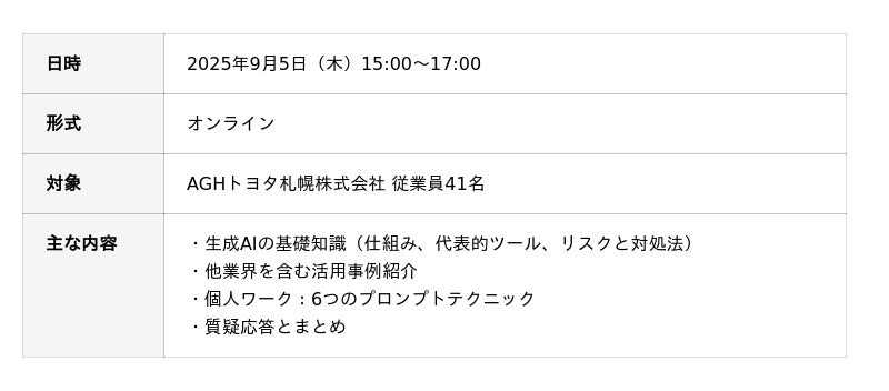 株式会社TENHO(本社:東京都渋谷区、代表取締役:田村 允/土田 龍矢、以下「当社」)は、2025年9月5日(木)、AGHトヨタ札幌株式会社(本社:北海道札幌市、代表取締役社長:西川 友晴、「以下「AGHトヨタ札幌」)の従業員を対象に、生成AI活用の基礎に関するオンラインセミナーを実施しました。本セミナーは、東武トップツアーズ株式会社(本社:東京都墨田区、代表取締役:百木田 康二、以下「東武トップツアーズ」)との共同開催により実現したものです。