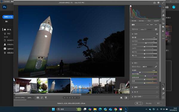 まずは画像編集・デザインソフトの「Adobe Photoshop 2025」を使ったRAW現像の速度をチェックする。PhotoshopはRAW現像にも対応しており、デジタル一眼やハイエンドスマートフォンで撮影したRAWデータを扱えるようになっている。ここでは、撮影した写真のRAWデータの現像処理速度を比較した。検証内容は2400万画素のRAWデータ100枚をCamera RAW 17.5で読み込み、500万画素に縮小し、シャープ出力(スクリーン標準)、JPEG(画質10、最高)で出力するというものだ。