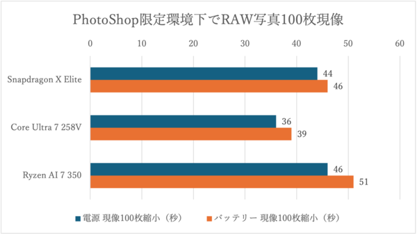 結果として一番早いのはCore Ultra 7 258Vの36秒だが、Snapdragon X Eliteも遜色ない速度で処理できた。注目ポイントは、ACアダプター接続で処理中の平均的なシステム供給電力はSnapdragon X Eliteは約34Wと一番少なく、Core Ultra 7 258Vは47W、Ryzen AI 7 350が43Wだった。