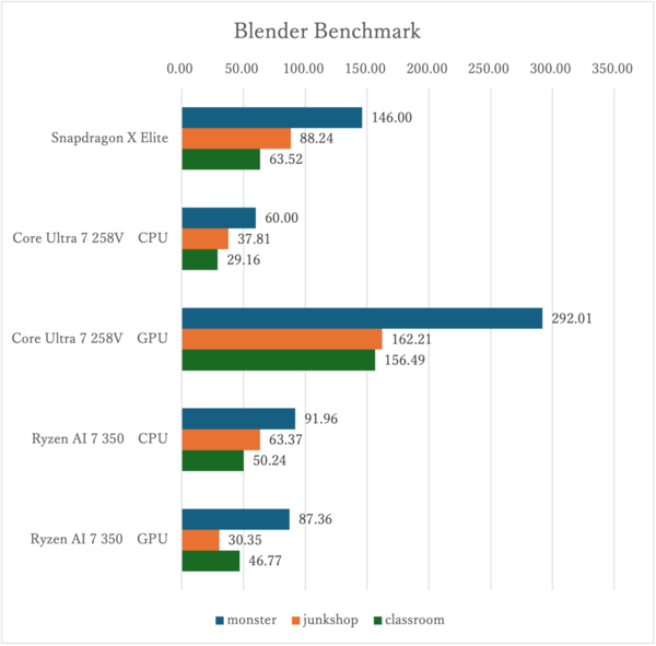 テストはレンダリング速度の計測用に公式で提供されている「Blender Benchmark」で比較した。なお、Snapdragon X EliteはCPUのみの結果を掲載。Core Ultra 7 258VとRyzen AI 7 350はCPUとGPUを利用した場合のテストも掲載している。