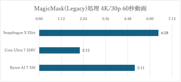 ここでは、動画に映っている人物または物体を指定すると、AIが自動的にマスク処理を行う「Magic Maskの処理」について比較した。具体的にはACアダプターに接続した状態で、60秒の4K/30Pの動画に映っている人物に対して、Magic Mask (Legacy/速度優先)を実行し完了までの時間を計測している。