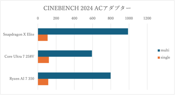 まずはACアダプターに接続した状態での計測。クリエイティブ系のアプリケーションを使用する際に重要なマルチコア性能を比較するMultiのスコアでは、Snapdragon X Eliteが他社モデルを引き離す結果になった。Snapdragon X Elite搭載のCopilot+ PCはAIやビジネス系の処理だけでなく、外出先でちょっとした動画編集や画像編集をこなすのに十分な性能を持ったパソコンと見ることができる。