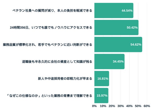 - 次いで「24時間365日、いつでも誰でもノウハウにアクセスできる」(50.42%)、「ベテラン社員への質問が減り、本人の負担を軽減できる」(44.54%)が続き、「品質向上」「アクセシビリティ」「負担軽減」が三大メリットとして期待されている。