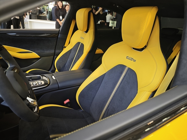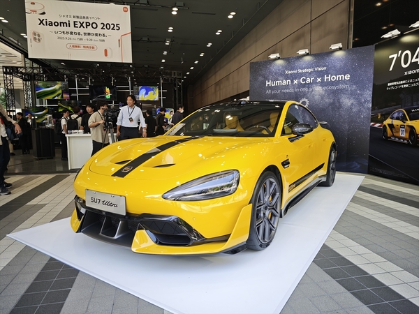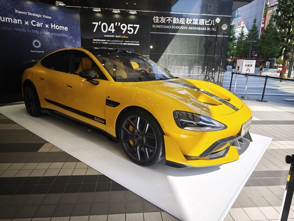 20種類以上の製品が発表会でお披露目されたが、その中で一際目を引く存在が発表会では触れられなかった、シャオミのEV「Xiaomi SU7 Ultra」だ。通りに面したエリアに置かれている真っ黄色のボディーは非常に目立ち、通りすがりの人も足を止めて熱心に撮影していた。
