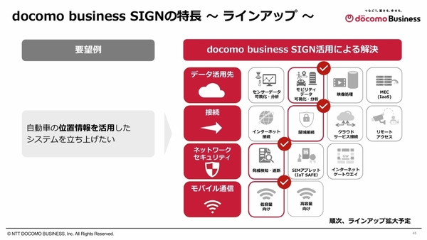 例えば、自動車の位置情報システムを構築したい場合には、「低容量」のモバイル回線を選択し、標準のネットワークセキュリティを活用、接続には「閉域接続」、そしてデータ活用に「モビリティデータの可視化・分析」を利用するといった形だ。