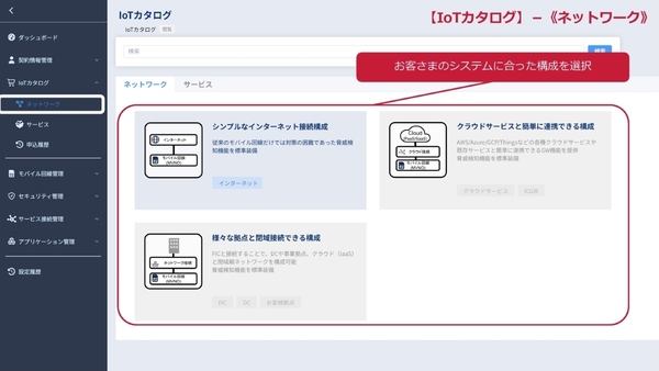 3つ目の特徴は、「テンプレート」機能だ。構築のコストや手間を軽減できるよう、標準的な構成において、必要となるモバイル回線や機能を組み込んだテンプレートを用意。Webポータルから「シンプルなインターネット接続」や「複数拠点との閉域接続」といった構成を選択するだけで、標準的な設定ですぐにシステムを動かすことができる。