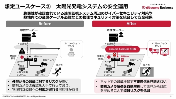 docomo business SIGNで想定するユースケースの例として、駐車場に設置されたIoT機器の遠隔集中管理や、監視カメラ画像の自動解析を用いた太陽光発電システムの盗難対策・統合的なセキュリティ強化が紹介された。