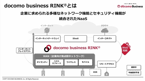 docomo business RINKは、WANやインターコネクト、モバイルなどのネットワークに、インターネットゲートウェイやリモートアクセス、IDaaS、CASB、エンドポイントなどのセキュリティ機能を統合したNaaSサービスである。