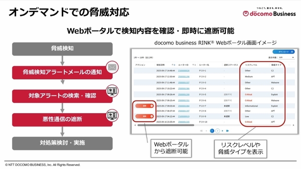 脅威検知の機能では、危険性の高いサイトとの通信を検知するとメールでアラートが届き、Webポータル上から即座に通信を遮断できる。拠点で発生した脅威に対して、本社などから一元的に対応可能だ。これまで59社が同機能をトライアルをする中で、10社が「疑わしい通信」を検知し、その内の5社が「高い感染リスク」を確認したという。