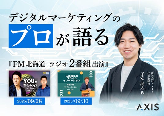 株式会社AXIS(本社:東京都新宿区、代表取締役:子安勘太)は、代表の子安勘太が、FM北海道(AIR-G')「山本昌弘のプライムイノベーション」および「YOUとすぐイノベーション」の2番組に出演することをお知らせいたします。デジタルマーケティングの専門家として、ビジネスの成長戦略からトレンドSNSの話題まで、幅広いテーマについて語ります。