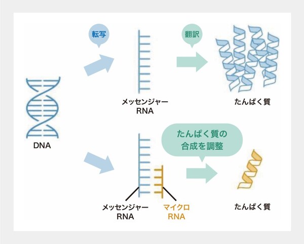 図1:DNAの遺伝情報がメッセンジャーRNAに転写され、たんぱく質が作られる一連の流れは「セントラルドグマ」と呼ばれる。一方、マイクロRNAはたんぱく質を直接作るのではなく、合成を調節することで、生物の成長に重要な役割を果たしている。