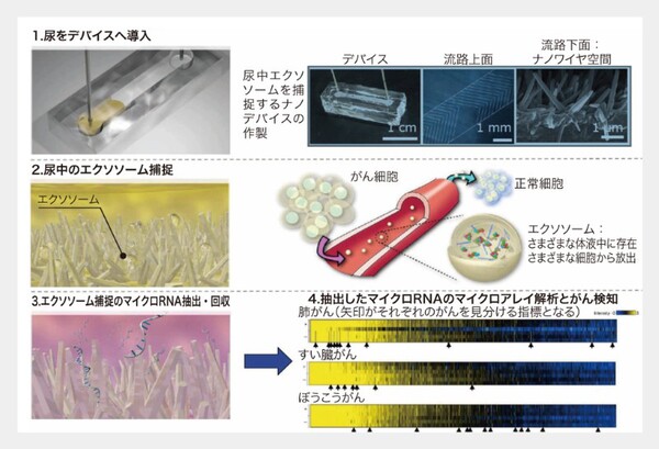 図2:安井さんが開発したデバイス。尿をデバイスに導入すると、ナノワイヤがエクソソームを捕捉して、マイクロRNAを抽出する。抽出したマイクロRNAに対して遺伝子の発現レベルや変異を調べる「マイクロアレイ解析」をすることで、がんを検知する。