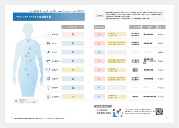 図5:総合結果表のサンプル。全部位の検査結果を一覧化し、色分けとアイコンで、現在のリスクと行動指針を直感的に把握できる。同時に送付される結果表では、がん種ごとに関連するマイクロRNAの測定結果をグラフや数値で解説している。