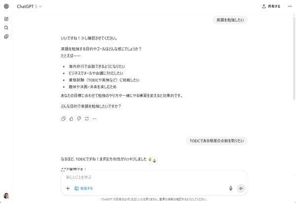 従来も、プロンプトを工夫すれば学習に活用することができたが、2025年7月、ChatGPTに学習モードが追加された。ユーザーはゴールを指示するだけで、ChatGPTが必要に応じて問いかけ、学習プランからテストの作成まで一人一人に最適化された学びを提供してくれる。
