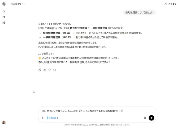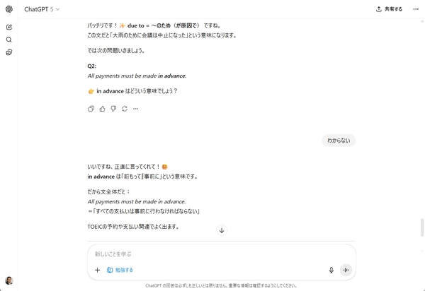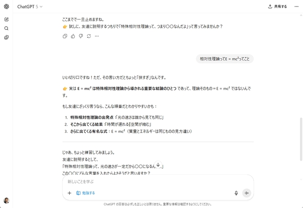 今回、「人に説明できるようになりたい」と伝えたところ、一通り学習したあと、説明するように指示してきた。そして、回答すると、褒めつつもダメ出しして、また親切に解説してくれる。ChatGPTがユーザーの理解レベルを把握し、適切な教え方をしてくるので、学習のモチベーションも維持しやすい。