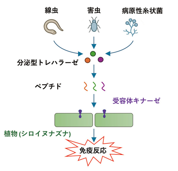 理化学研究所環境資源科学研究センターの白須賢グループディレクターらの研究チームは、実験室で大量培養が可能な種類の線虫が、植物への寄生能力がないにもかかわらず、シロイヌナズナに強い免疫反応を引き起こすことを発見。この線虫の抽出液から活性物質を精製することにより「分泌型トレハラーゼ」と呼ばれる酵素の一部で、わずか24個のアミノ酸から成るペプチドが、免疫反応の原因になることを明らかにしました。さらに、この免疫反応を起動するために植物が用いている受容体のリン酸化酵素も同定しました。また、このペプチドが植物に寄生する多様な線虫、害虫、病原性糸状菌に共通して存在していることもわかりました。